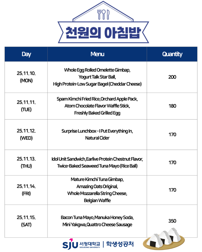 [식단표(천원의 아침밥)] 11월 2주 천원의 아침밥 메뉴 안내 N