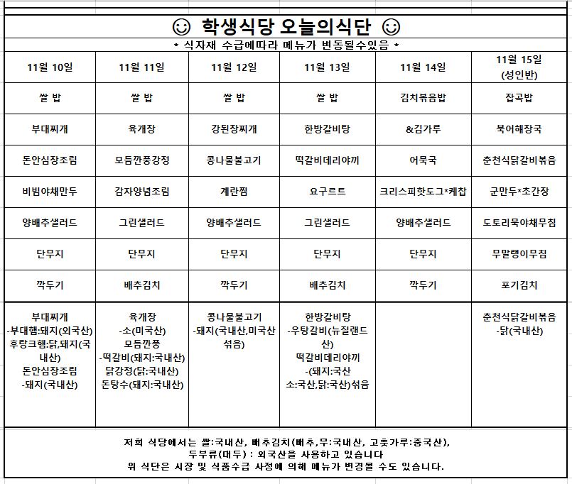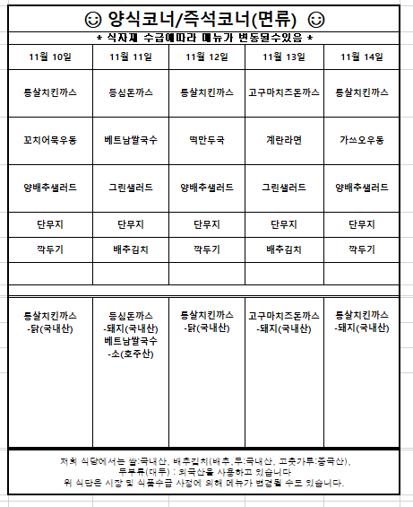 [공지] 11월2주차 학생식당 주간식단안내입니다. N