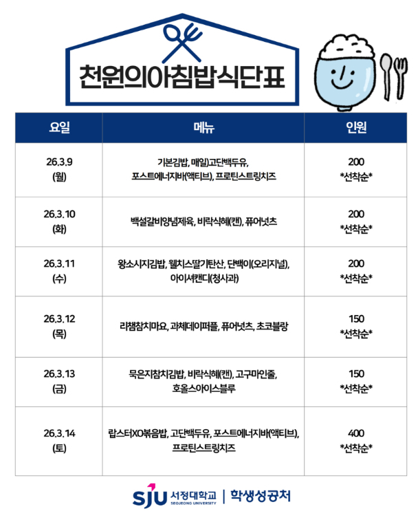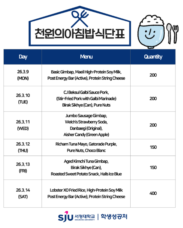 [식단표(천원의 아침밥)] 3월 2주 천원의 아침밥 메뉴 안내 N