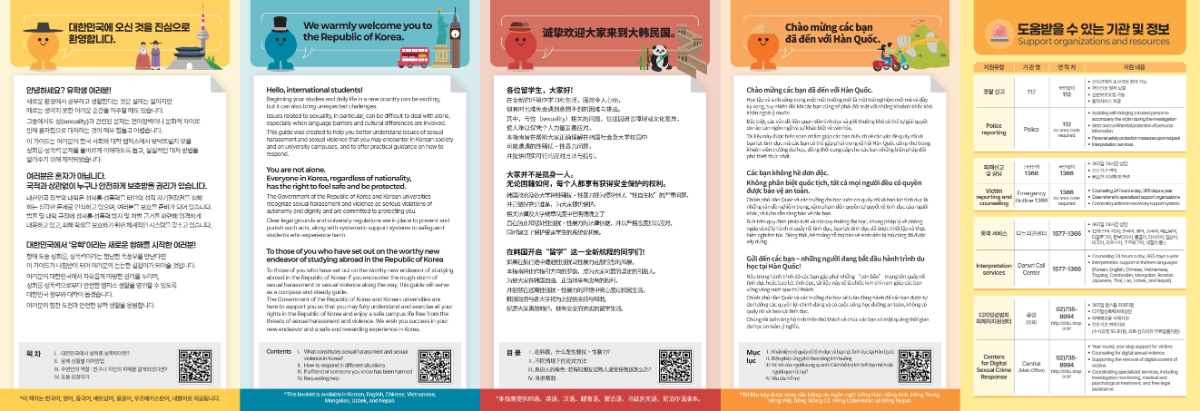 이에 본 가이드는 외국인 유학생들이 한국 사회 및 대학 캠퍼스에서 발생할 수 있는 성희롱·성폭력 상황을 올바르게 이해하고, 실제 상황에서 적절히 대응할 수 있도록 다음과 같은 내용을 포함하고 있습니다.