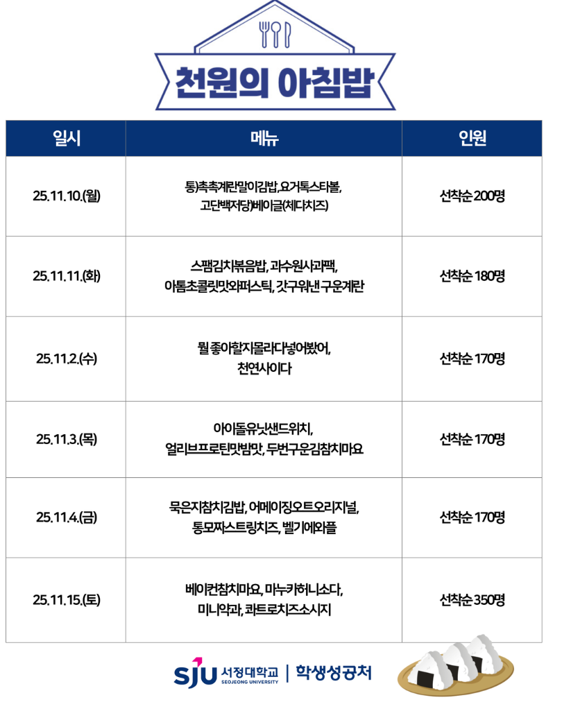 [식단표(천원의 아침밥)] 11월 2주 천원의 아침밥 메뉴 안내 N
