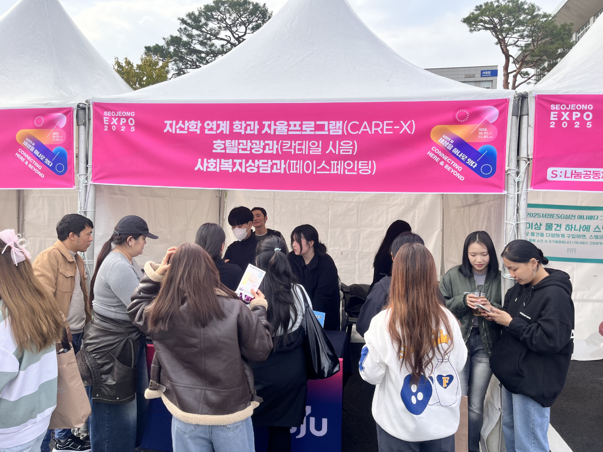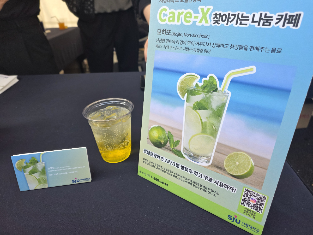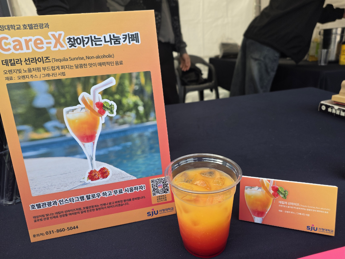 1. 2025학년도 용암제 성과 10.31(금) 학과부스 운영 라운딩 수상 11.01(토) 학과부스 운영 라운딩 수상 11.01(토) 성인학습자 영상공모전 최우수상 수상 : 성인학습자 이경희 11.01(토) 산업체 위탁 영상공모전 최우수상 수상 : 안산 위탁교육장 2. 2025학년도 서정EXPO ‘찾아가는 나눔카페’ 운영 서정대학교 호텔관광과는 전문대학 혁신지원사업의 일환으로, 10월 31일(금) 서정EXPO에서 CARE-X ‘찾아가는 나눔카페’를 운영했습니다. 이번 프로그램은 혁신지원사업단이 주최하고 대외협력처가 주관하였으며, 교직원 및 재학생을 대상으로 칵테일(모히또 및 데킬라선라이즈) 시음체험 및 학과 인스타그램 팔로우 이벤트 등을 진행한 활동이었습니다.