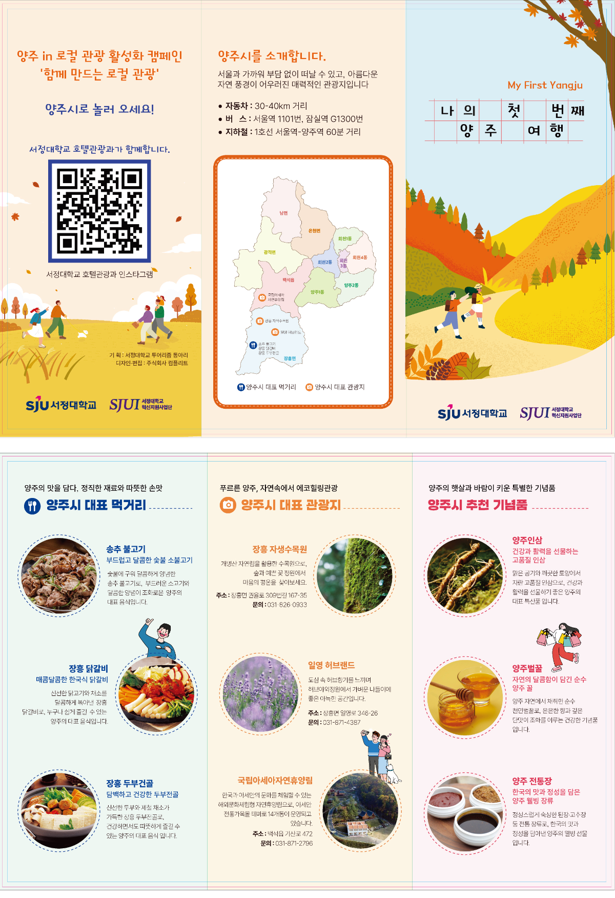 서정대학교 호텔관광과 전공 동아리인 ‘투어리즘’은 동아리 캡스톤디자인으로, 양주시 관광홍보 리플렛(한국어 및 베트남어 버전 2종)과 홍보용 카드뉴스를 제작했습니다. 리플렛과 카드뉴스는 ‘양주 in 로컬관광 활성화 캠페인’의 일환으로 제작되었으며, 양주시 대표 먹거리, 대표 관광지, 추천 기념품을 소개하는 내용을 담고 있습니다.